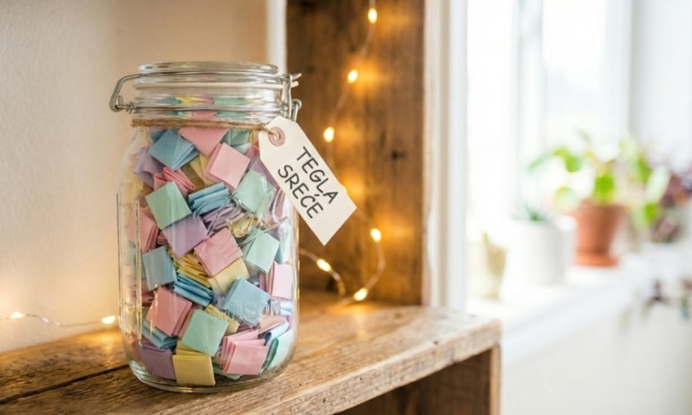 - Tegla sreće: Uzmite ukrasnu teglu i u nju ubacite 365 papirića. Na svakom napišite po jedan razlog zašto volite tu osobu, neku zajedničku uspomenu ili motivacioni citat. Osoba otvara po jedan papirić svakog jutra narednih godinu dana.